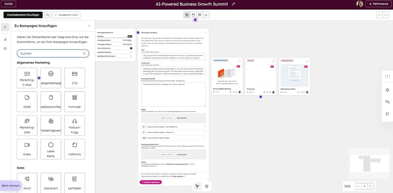 - Der visuelle Canvas: Anstatt sich durch Listenansichten zu klicken, ziehen Sie Ihre Assets (E-Mails, Landing Pages, Social Posts, Ad-Sets, CTAs) per Drag-and-Drop auf eine digitale Leinwand. Sie sehen sofort, wie die Kampagne visuell zusammenwirkt.